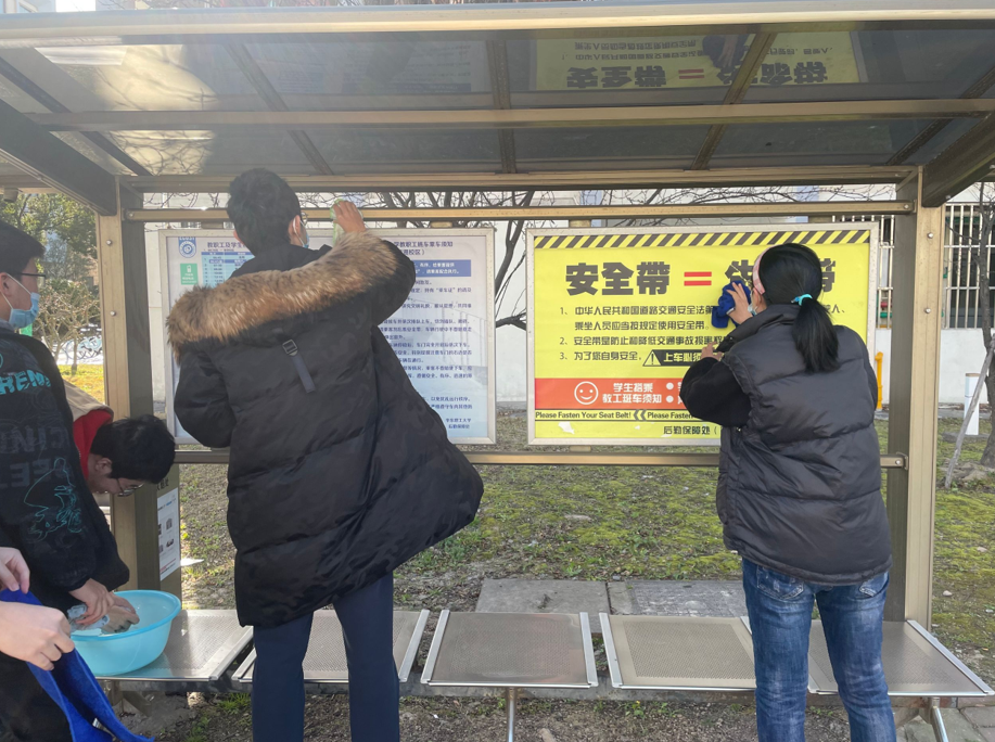 每周,班级同学都会利用课余时间,捡拾草坪垃圾、擦拭机房显示器,或清扫公交站台等,为建设美好校园贡献力量。