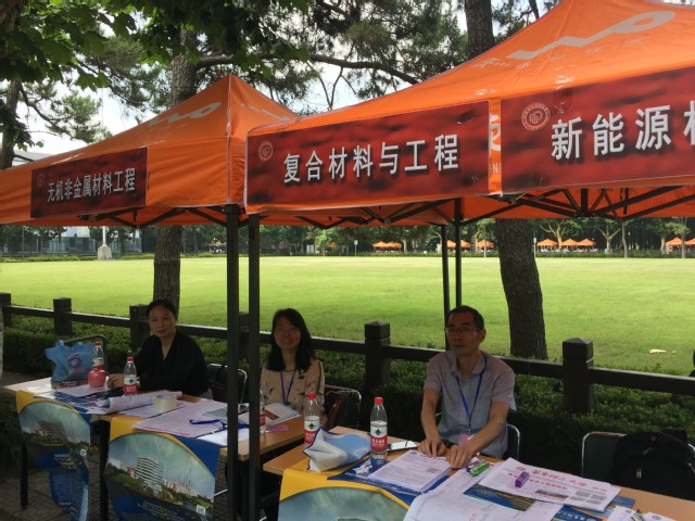 6月18日,正值中国传统节日-端午节,2018年华东理工大学招生咨询会如火如荼地召开了。大草坪两旁林荫大道的各专业咨询台吸引了众多家长和高考学子们。材料学院副院长李欣欣、专业责任教授顾金楼和朱以华、无机系系主任曾惠丹、高分子系系主任周权和学院办公室主任顾婷都来到咨询会现场,悉心地为高考学子和家长们做着解答。