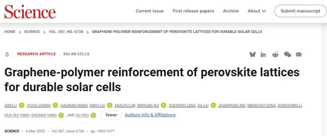 钙钛矿太阳电池作为极具应用前景的新型光伏技术,具有效率高、成本低、柔性与轻量化等优势,对解决能源与环境问题具有重要意义,然而,器件不稳定性是限制其产业化发展的首要挑战。 北京时间3月7日凌晨,华东理工大学材料学院清洁能源材料与器件团队侯宇教授、杨双教授等,在Science (《科学》)发表了题为“Graphene-polymer reinforcement of perovskite lattices for durable solar cells”的最新研究成果。 该研究发现了钙钛矿光伏不稳定性的关键机制——光机械诱导分解效应,提出石墨烯-聚合物机械增强钙钛矿材料的新方法,制备的太阳能电池器件在标准太阳光照及高温下的T97工作寿命创下3670小时新纪录,该研究成果将为钙钛矿太阳电池的产业化应用提供全新解决方案。 ▲ 图1. 《科学》期刊发表清洁能源材料与器件团队最新研究成果 作为光伏电池的关键组分,钙钛矿材料表现出典型的软晶格特性,在水氧、光照、高温和电场等环境因素作用下,容易发生化学分解及结构退化,导致器件效率大幅下降。 “传统理论认为,光、热等因素直接引起钙钛矿的氧化还原、离子迁移等分解行为。我们发现,上述因素首先在材料内导致局域应力,而这类‘动态应力’才是诱发材料分解的元凶,这就是光机械诱导分解效应。”据侯宇介绍,在太阳光照下,钙钛矿材料表现出显著的光致伸缩效应,膨胀比例可超过1%,这将导致钙钛矿晶体之间的挤压,并在晶界附近积累局部应力,加速了晶界区域的缺陷形成,造成了钙钛矿电池的性能损失。 钙钛矿太阳电池结构一般由五层组成,从上至下分别为导电玻璃、空穴传输层、钙钛矿、电子传输层、金属电极。为了提升处于核心的钙钛矿材料的稳定性,科学家们尝试改变钙钛矿组分和结晶性,或设计控制钙钛矿表面分子结构,但仍难达到商业化应用标准。“光机械诱导分解效应”的发现,为理解钙钛矿材料的退化机制提供了新的视角,并为进一步提高其稳定性提供了重要思路。 ▲ 图2. 石墨烯-聚合物耦合双层界面结构,实现兼具高强度、高韧性以及优异电荷输运特性的钙钛矿薄膜材料 石墨烯具有超高模量(约1 TPa),是钙钛矿材料模量的50~100倍,且具有均匀致密、耐机械疲劳和化学稳定的优点。有没有可能借用石墨烯这个“外援”,来提升钙钛矿的稳定性呢?然而,石墨烯与钙钛矿并不兼容,如何实现是一大难题。 经过多次尝试,团队发现,可以通过聚甲基丙烯酸甲酯(PMMA)聚合物界面耦联方式,将单层整片石墨烯组装到钙钛矿薄膜表面,从而实现两者的高均匀度、多功能性集成。由此,一个新型钙钛矿太阳能电池器件形成(图2)。 得益于石墨烯出色的机械性能和聚合物的耦合效应,钙钛矿薄膜的模量和硬度提高了两倍,并显著限制了在光照条件下的晶格动态伸缩效应。研究表明,石墨烯-聚合物双层结构将晶格变形率从+0.31%降低至+0.08%,有效减少了晶界附近由膨胀引起的材料破坏。 ▲ 图3. 石墨烯-聚合物耦合界面实现钙钛矿太阳能电池工况寿命的新突破 通过动态结构演变实验和计算模型相结合,研究团队验证了该耦合界面结构在工作条件下,能够有效抑制晶格变形以及横向离子扩散,从而确保钙钛矿器件在光照、高温及真空等环境下的长期稳定性。基于这一设计,太阳电池在标准太阳光照及高温(90℃)条件下,T97工作寿命(效率衰减至97%)达到3670小时(图3)。 多年来,清洁能源材料与器件团队聚焦国家“双碳”战略,已在新型光伏领域取得系列研究成果,如建立了一套理论设计及精准筛选太阳能电池关键功能材料的通用方法,突破传统材料合成的瓶颈,开发出一系列高性能、稳定的光电功能晶态材料,提出光伏器件表面分子功能化新方法,显著提升太阳电池的环境稳定性,等等。 对于通过石墨烯-聚合物耦合界面实现钙钛矿光伏工况寿命新突破,侯宇认为,该研究成果的重要意义在于揭示了光伏性能退化的未知关键因素——“光机械诱导分解效应”,从根本上理解了钙钛矿薄膜在实际应用过程中出现的动态结构损伤及其机械强化调控原理,为克服稳定性瓶颈、推动钙钛矿器件的工业化生产和应用提供了新的解决方案。 华东理工大学为该工作的唯一通讯单位,通讯作者为侯宇教授和杨双教授,第一作者为材料学院博士研究生李庆,该研究工作得到了华东理工大学杨化桂教授的悉心指导,上海大学郑祎初副研究员在理论模拟方面提供了重要支持。研究工作还得到了国家自然科学基金、上海市基础研究特区等项目资金的支持。 文章链接:https://www.science.org/doi/10.1126/science.adu5563 转自 | 华东理工大学