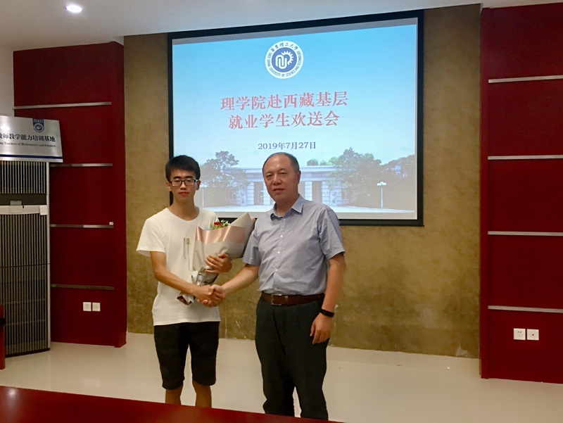 7月27日,理学院在实验二楼115会议室为即将奔赴西藏日喀则地区工作的2019届毕业生张国文举行欢送会。理学院党委书记童之敏、党委学生工作部副部长郑东、理学院辅导员陈伟杰、班级学生代表等出席欢送会。欢送会由理学院学生工作负责人黄文彬主持。