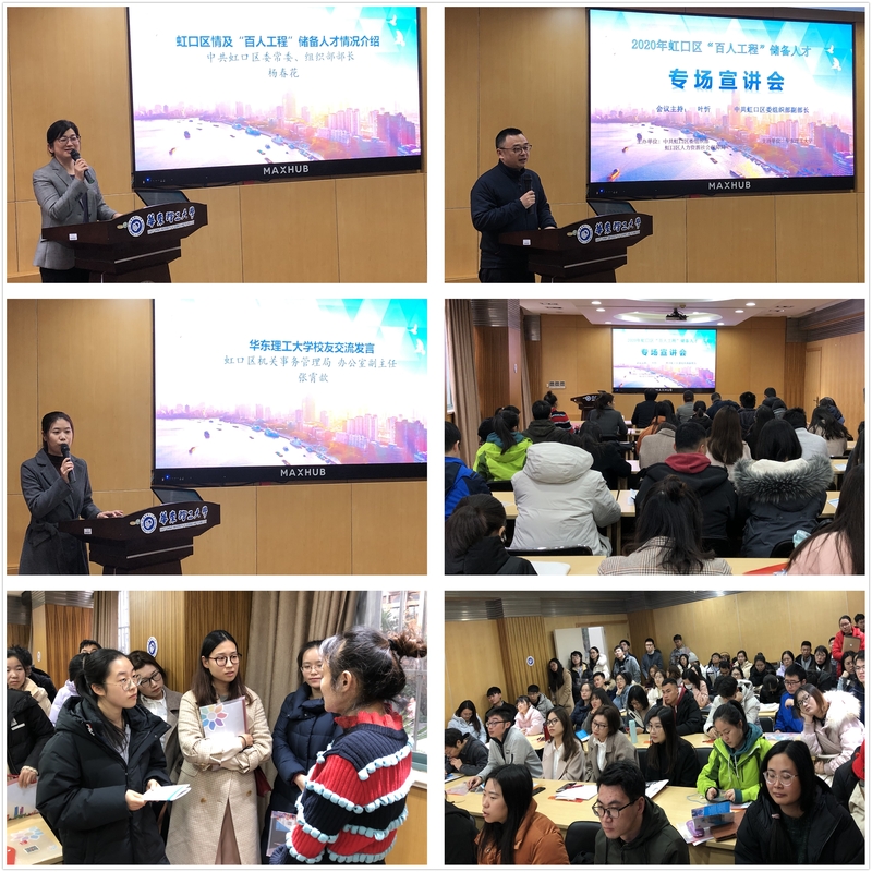 12月19日下午,2020年上海市虹口区“百人工程”储备人才专场宣讲会在我校徐汇校区实验十六楼108室举行。虹口区委常委、组织部部长杨春花,区委组织部副部长叶忻,区人力资源和社会保障局副局长李敏,我校学工部部长倪炜,学工部副部长郑东出席,活动由叶忻主持。