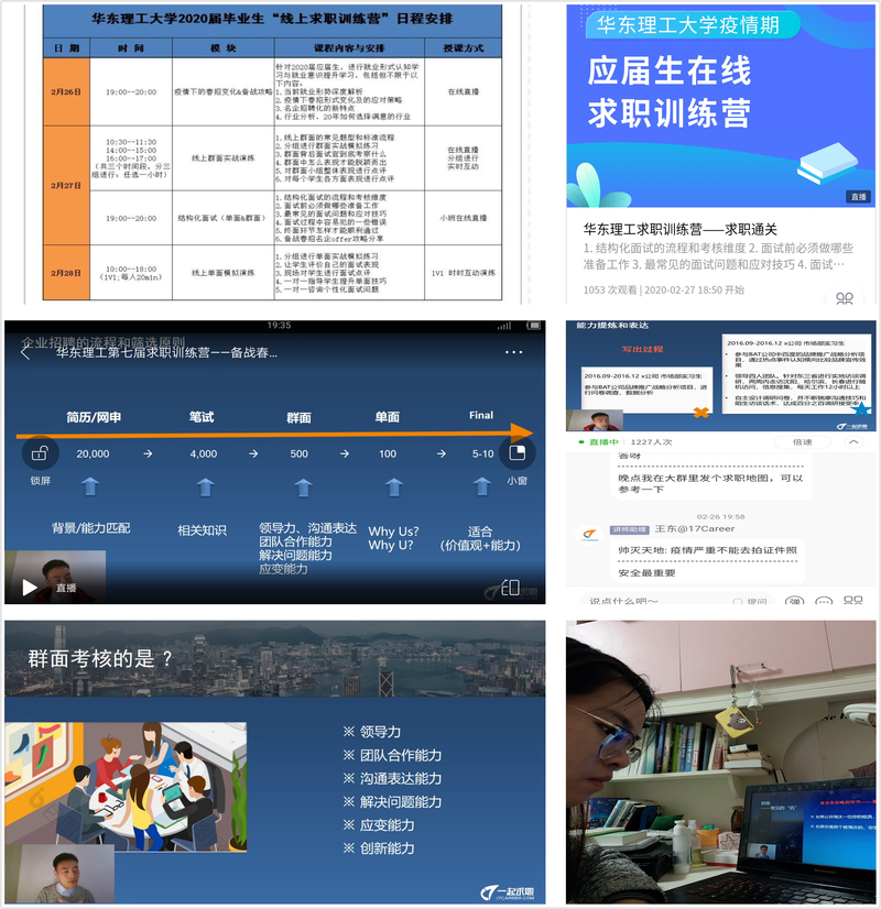 为切实保障毕业生身体健康和就业权益,最大限度降低疫情对毕业生就业影响,校学生就业指导服务中心邀请曹元东等多位生涯导师于2月26日至29日在线举办了第七届“求职训练营”,为疫情下的2020届毕业生指点迷津、助力起航。来自各学院的550余名本研毕业生和就业指导相关负责教师全程参加了线上培训,平均每场直播有1600余人次参与。