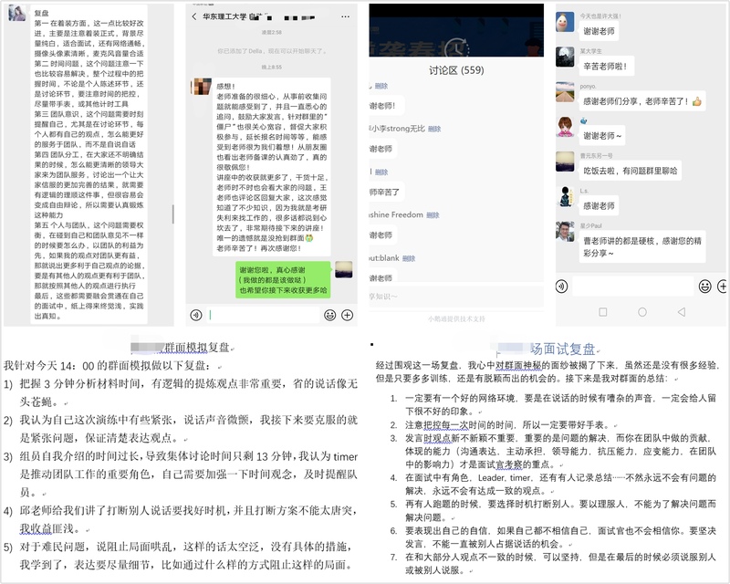 资源与环境工程学院研三毕业生孙同学坦言:“之前在秋招中屡战屡败,对很多问题自己并没有反思且不以为意。参加了本次线上求职集训后,我重新审视自己、如梦初醒!接下来,要充分利用时间和资源多学多练,做好对目标企业和自身的准备,迎战被疫情改变的春招。”信息科学与工程学院大四毕业生刘嘉丽表示,这次培训做到了心坎里!虽然自身考研成绩并不理想,但是通过这次系统学习,促使自己对未来的职业选择有了更深入的思考。来自生物工程学院的大四毕业生赵维长分享到:“之前对目标岗位、求职准备等充满了迷茫。通过老师的讲解点评和复盘指导,对简历撰写、网申流程、线上面试等招聘背后的用人逻辑有了更深的理解,大大增加了自己在疫情期的求职信心。”此外,在直播讨论区和微信交流群中,针对同学们提出的诸多学习问题和求职疑难,老师们一一进行了答疑指导。