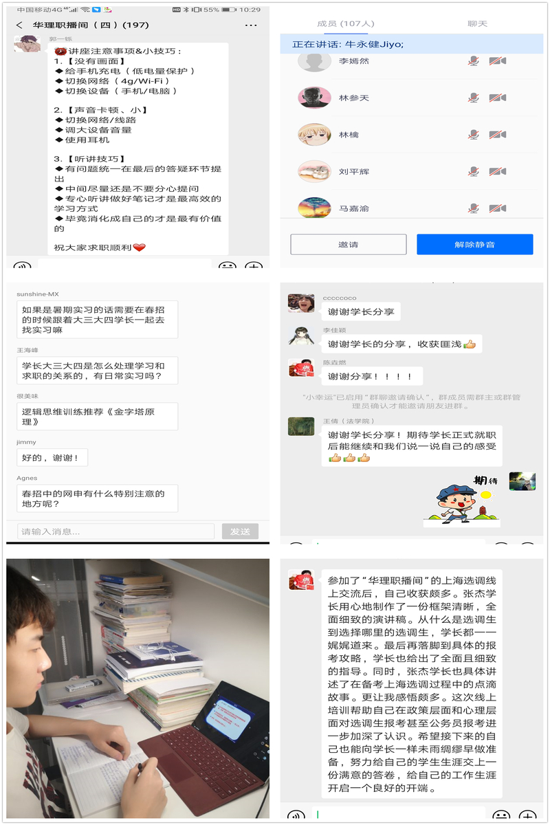 为提高线上交流实效,直播前,校就业中心都会提前征集问题或需求,并反馈给嘉宾做好针对性的准备。此外,在直播互动环节,各位嘉宾对同学们的疑惑也逐一进行了细致解答。参与同学纷纷留言,通过交流在自我职业发展探索道路上有了更多的选择、思考和行动。法学院大四保研的王倩多次参加线上交流,她分享到,“就业是每个人早晚都要跨过的一道坎。每次分享都能感受到学长们的用心和耐心,藉此机会也让自己这个‘求职小白’对外部世界有了更多的了解和更深的认识”。化学与分子工程学院大三年级的李佳颖,正在准备2021年的公考。她表示,活动恰逢其时,非常感谢张杰学长关于公务员报考和备考的经验传授,自己也将学以致用进入备战状态。