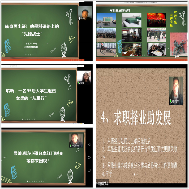 回首军旅路,阔步新征程。4月7日—14日,学工部就业指导服务中心举办了多场线上军旅生涯分享会,为热爱国防、有志参军报国的华理学子搭建互动交流和政策咨询平台。3位拥有参军入伍经历的应届/往届优秀毕业生应邀走进“华理职播间”讲述他们的军旅故事,从求职择业的角度畅谈自身“入伍前VS退伍后”的成长心路。100余名各年级有意应征入伍的学生参加了线上聆听和咨询。