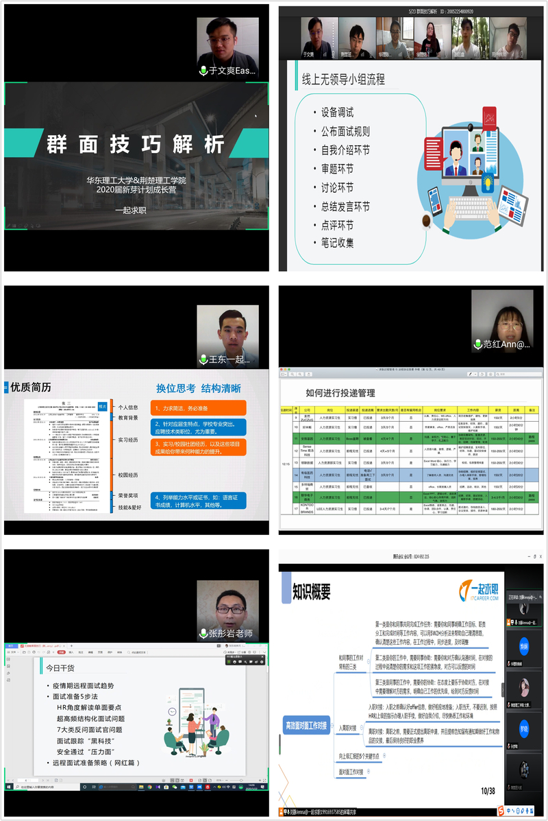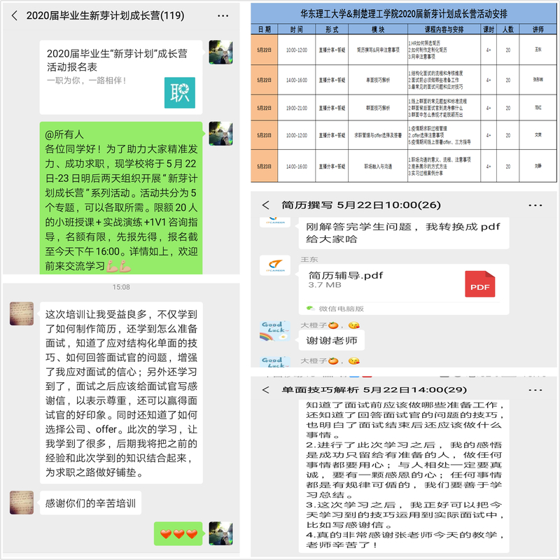为贯彻落实“稳就业”决策部署和教育部“一帮一”行动要求,切实做好重点群体的就业帮扶,5月22日-23日,我校和荆楚理工学院联合举办了线上“新芽计划成长营”,助力两校毕业生就业冲刺。一起求职联合创始人张彤岩等多位生涯导师担当主讲,解析了疫情下的校招变化和求职攻略,以及简历与网申、单群面技巧、求职管理、职场融入等要点难点。来自两校的百余名2020届毕业生和就业指导相关负责教师全程参加了线上培训。