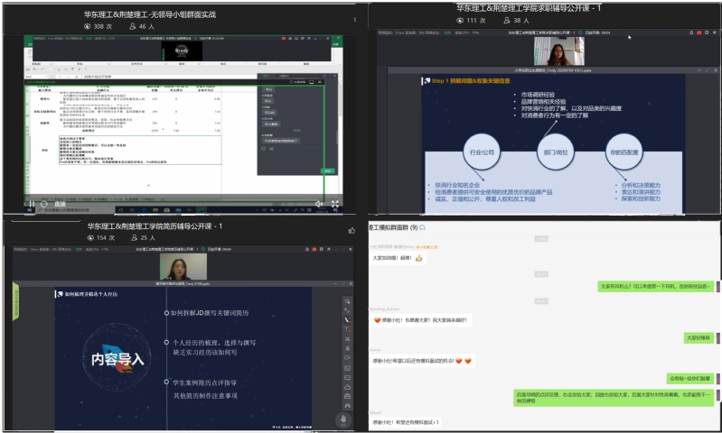 徐文杰通过无领导小组群面的实战演练,结合理论指导和学生实际表现,通过制定量化群面打分表格,逐点逐面地对群面的内容进行了剖析,介绍了群面的特点、场景以及应对技巧。缪欣从疫情下的招聘整体趋势、攻克求职难关的步骤以及结合自身多年的校园招聘经验给予毕业生建议,鼓励同学们提升自我认知、掌握就业信息、备好求职材料、提升求职技能、建立人脉关系,并结合自身的专业学习,提前规划自身的职业发展路线。王英针对毕业生简历上的常见错误,从简历关键词、个人经历的梳理和撰写以及通过简历案例点评,详细分析了简历撰写要点和关键信息。