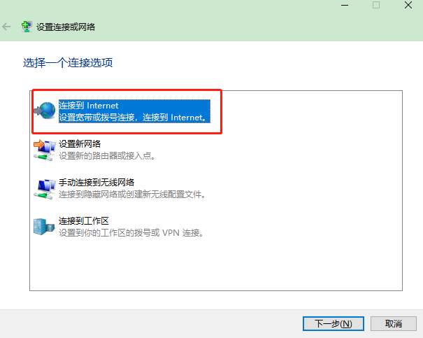 3、在选择“选择一个连接选项”中,选择“连接到Internet”,点击“下一步”;